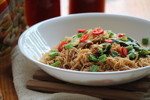 Tambahkan bihun dan dikacau sebati. Perasakan dengan kicap dan Sos Cili MAGGI. Gaul rata-rata.